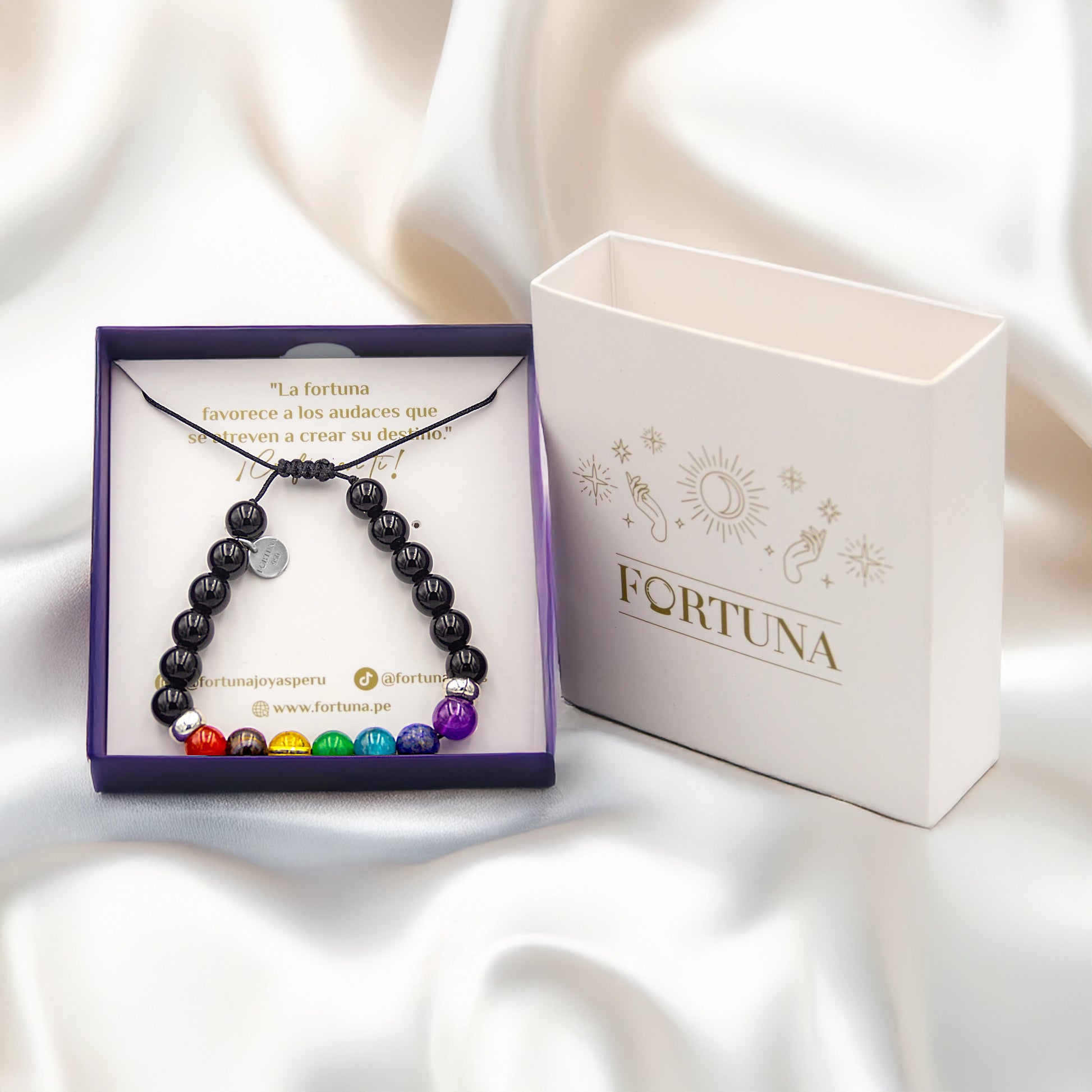 Este brazalete de 7 Chakras está diseñado para equilibrar tu energía y brindarte protección con la poderosa combinación de las piedras de los siete chakras y las enigmáticas piedras negras (como ónix, turmalina negra u obsidiana), conocidas por su capacidad para absorber las malas vibras y fortalecer el aura.